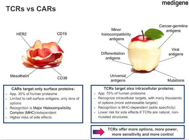 據雷博士介紹,CAR-T和TCR-T從整體的制備工藝到治療,途徑其實是一摸一樣的。包括從單采血到病毒載體/非病毒載體的改造,到后續的擴增和回輸。其中最大的區別在于CAR-T療法所識別的靶抗原均為細胞表面蛋白,而胞外抗原僅占總抗原的10%,因此如何尋找適合的靶點成為困難所在。而TCR-T 療法能識別組織相容性復合(MHC)分子呈現的細胞內的抗原片段,因此 TCR-T 療法具有更廣泛的靶點。